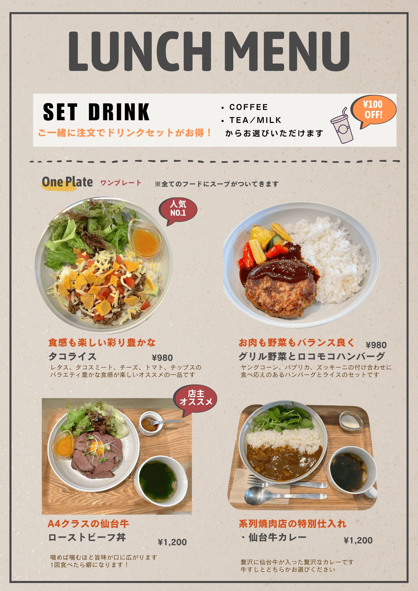 カフェスペースは、コワーキングスペースの利用者だけでなく、地域の方やドロップイン利用の方も気軽に利用できる、ひらかれた雰囲気が魅力です。各種ドリンクに加え、ランチタイムには軽食からしっかりとしたフードメニュー🍛まで、幅広いラインナップをご用意。